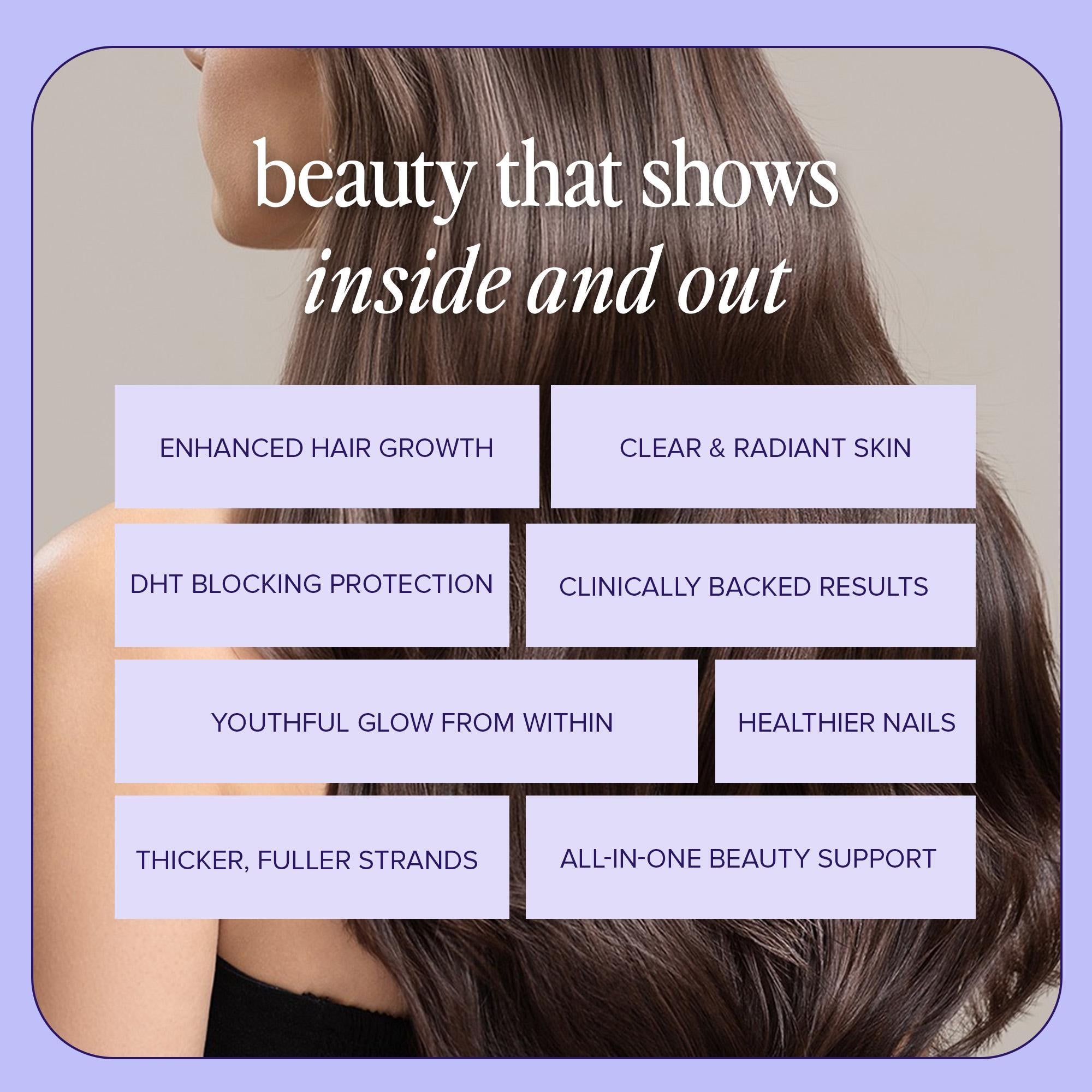 With Biotin, Green Tea, Hyaluronic Acid, and essential vitamins, Beauty+ delivers the key nutrients your follicles need to grow stronger, thicker hair that resists breakage and dryness. †