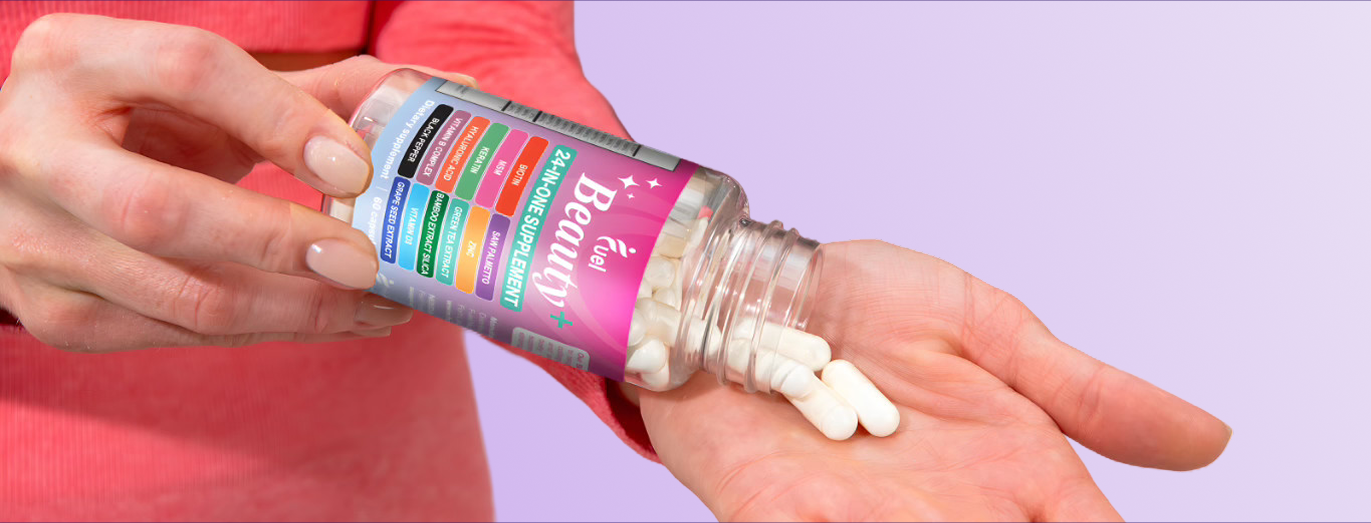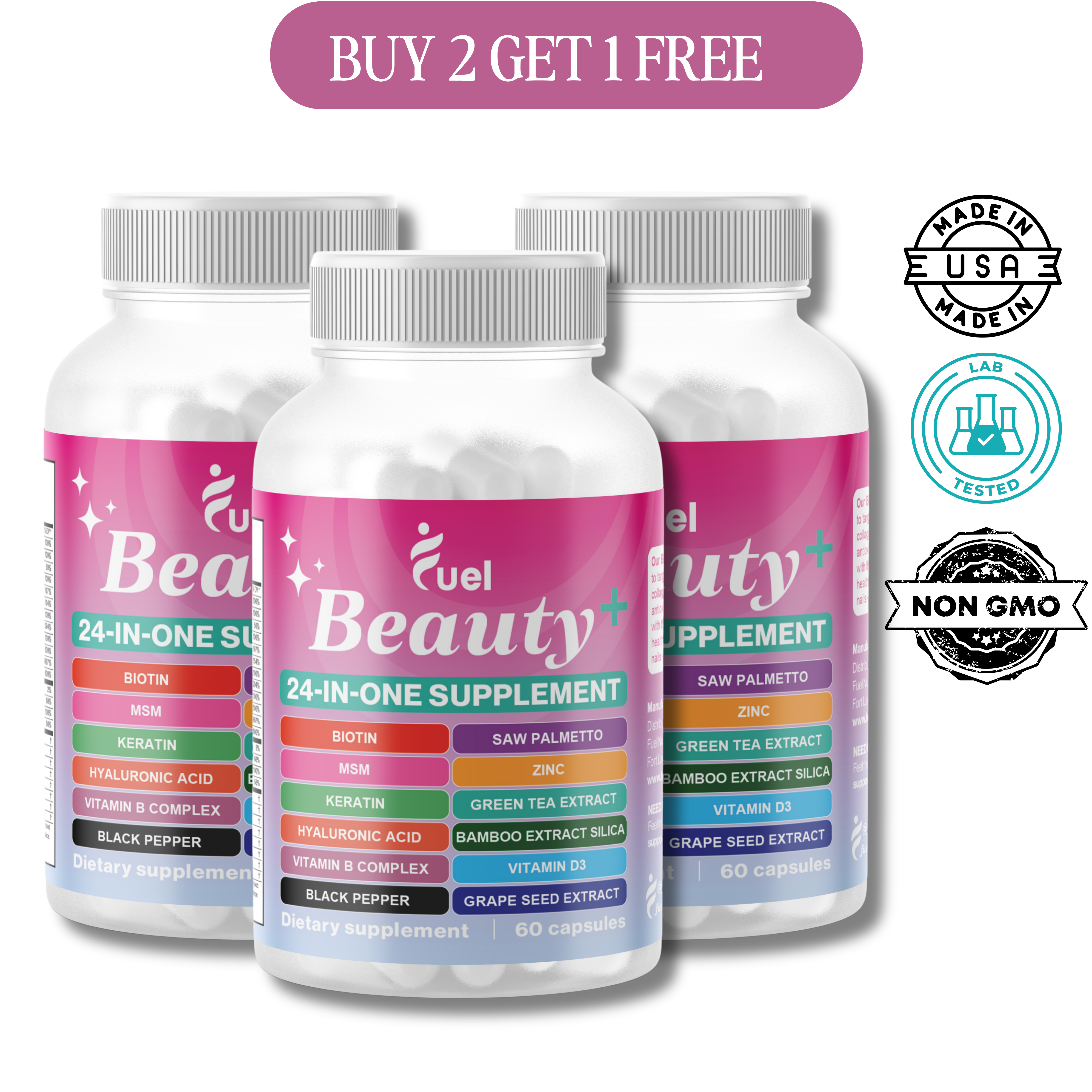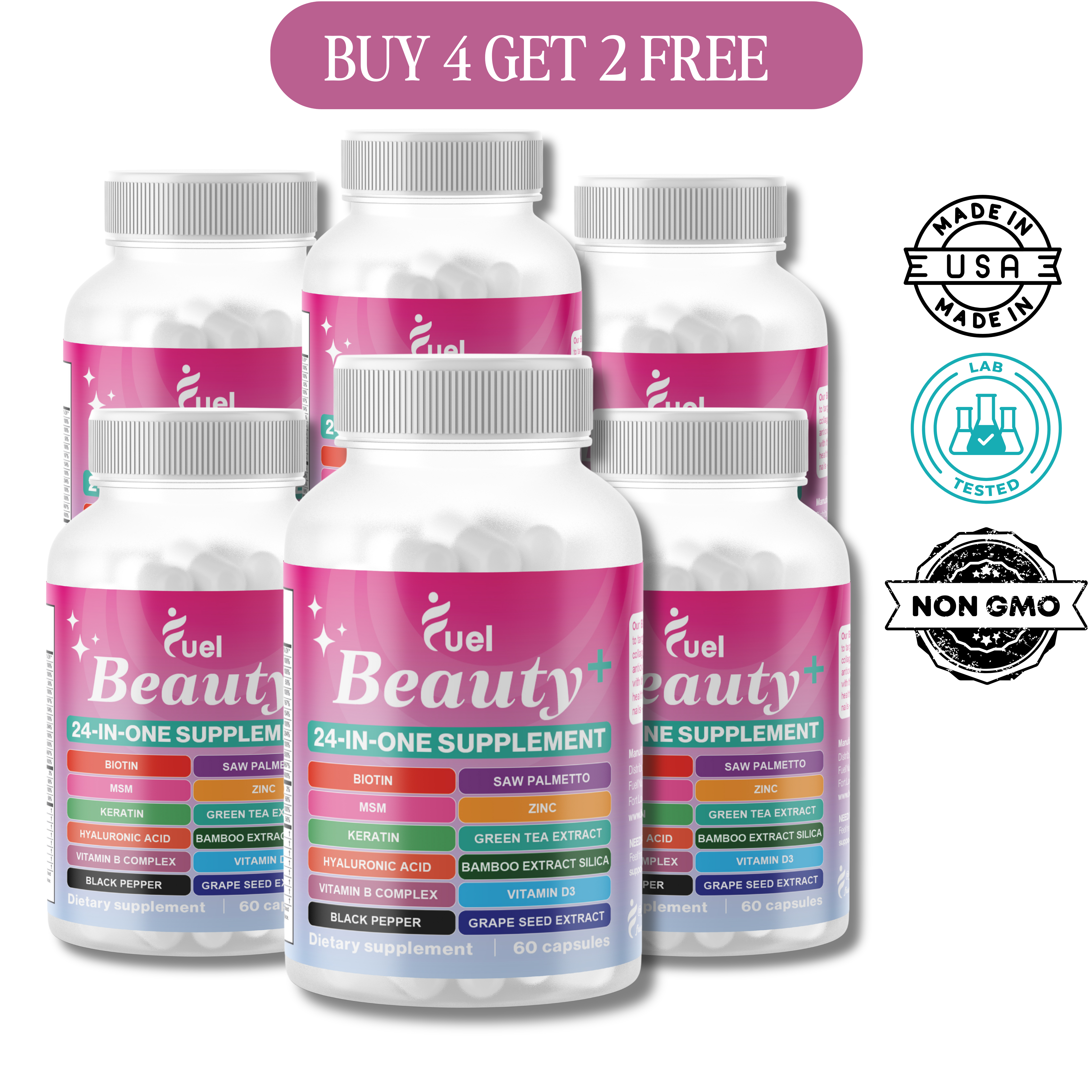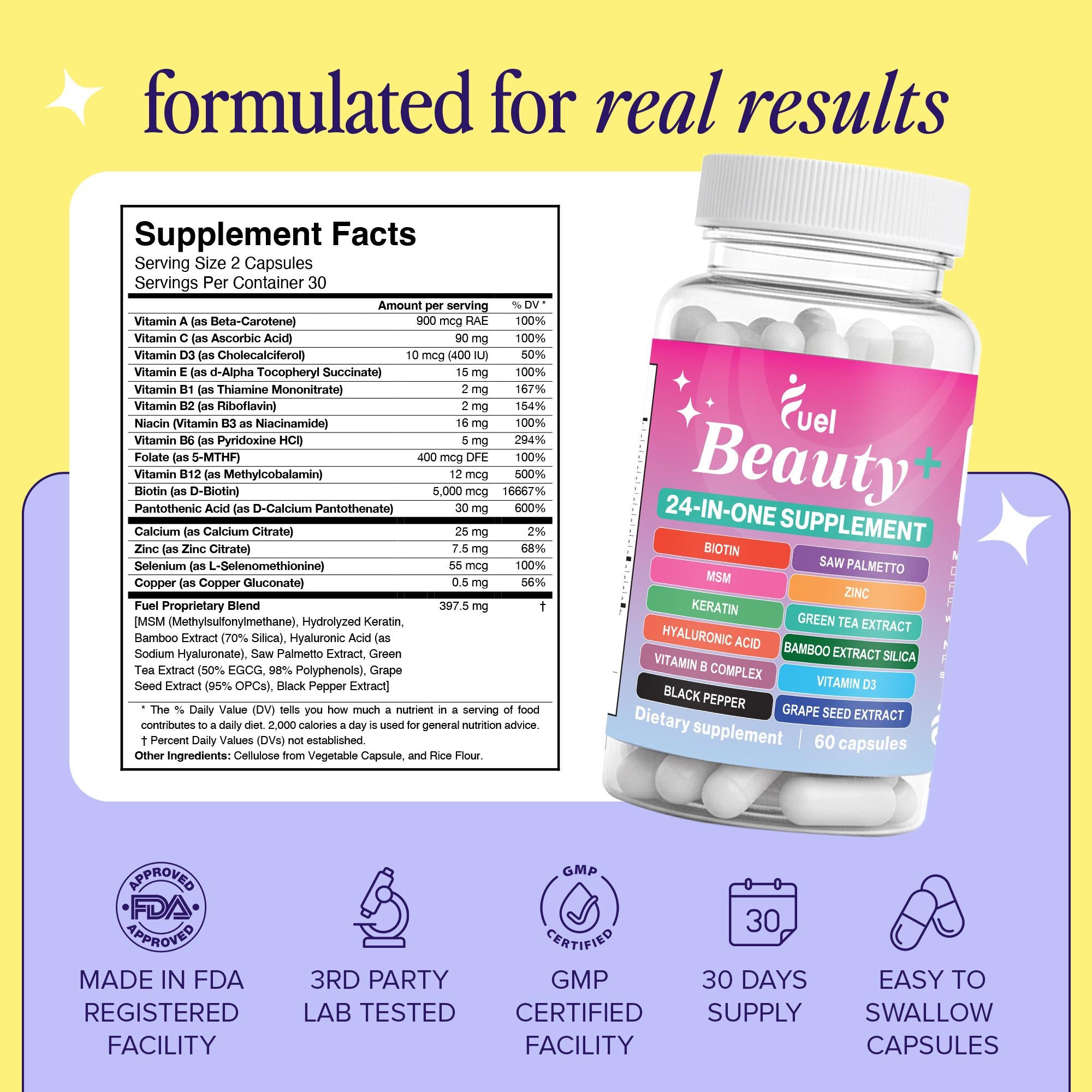 Fuel Beauty+ is designed as an all-in-one 24-in-1 formula. It combines essential vitamins, minerals, and botanicals to replace the need for 5-6 different supplements, offering a more convenient and powerful solution in one capsule.