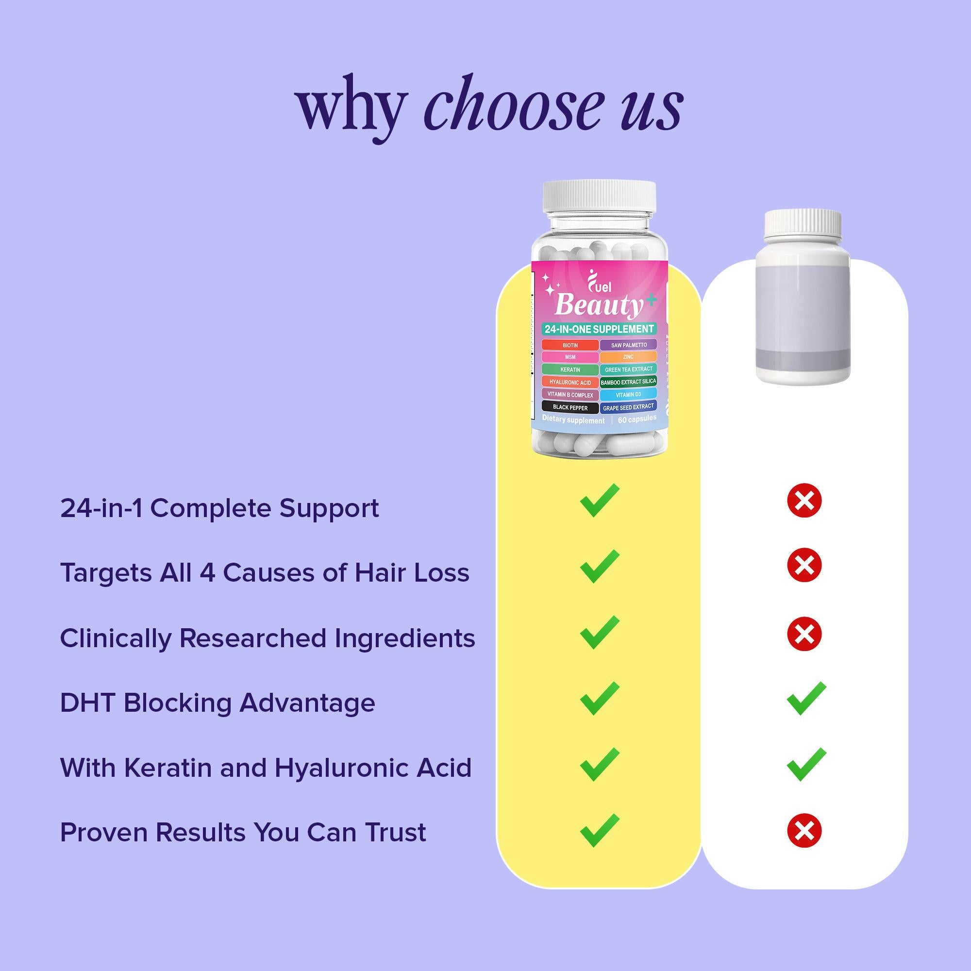 Most hair supplements and treatments address only one cause of hair loss, such as a nutritional deficiency. Fuel Beauty+ is a complete 24-in-1 formula designed to target all 4 major causes of hair thinning: hormonal (DHT), nutritional gaps, oxidative stress, and poor absorption.