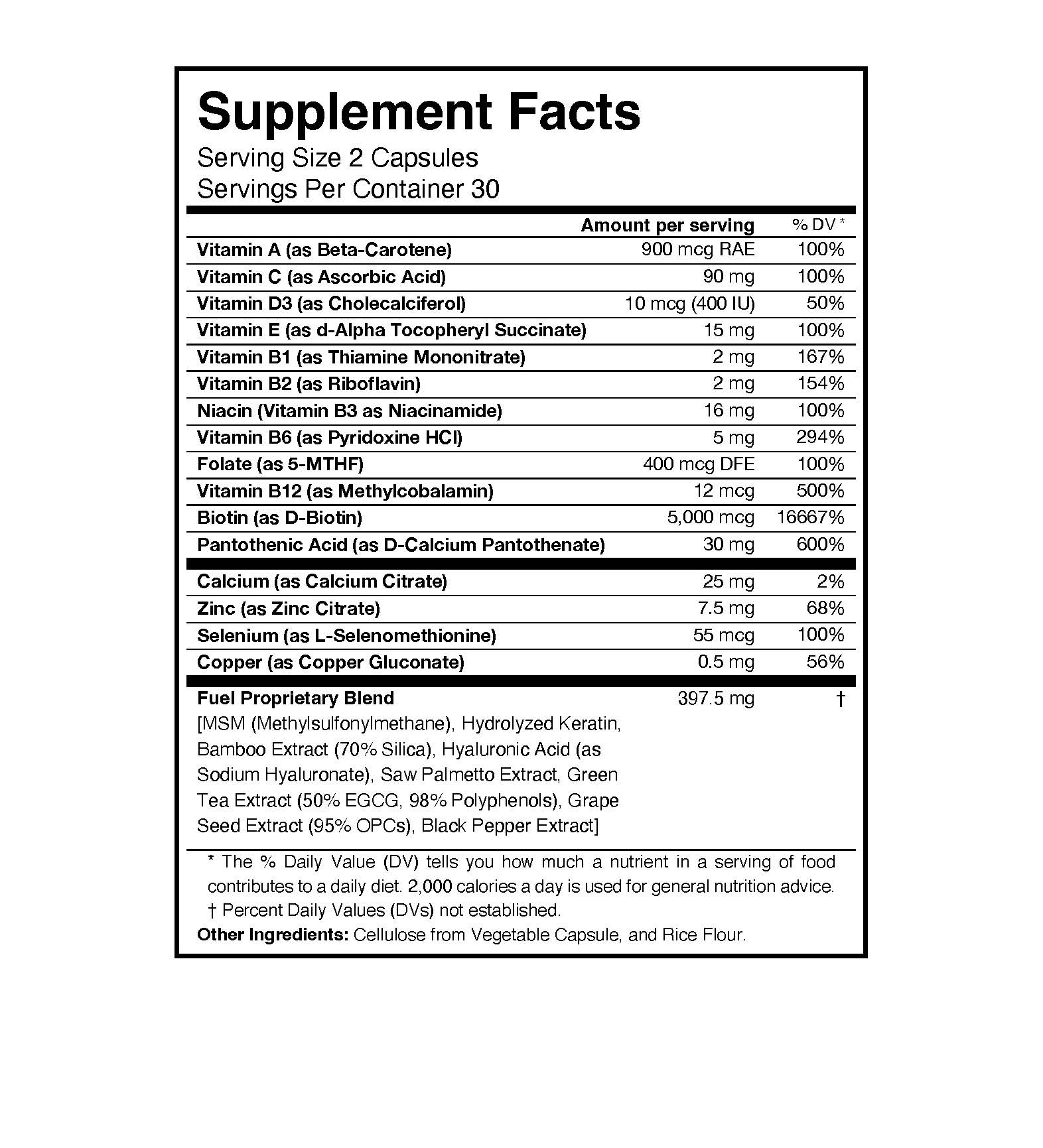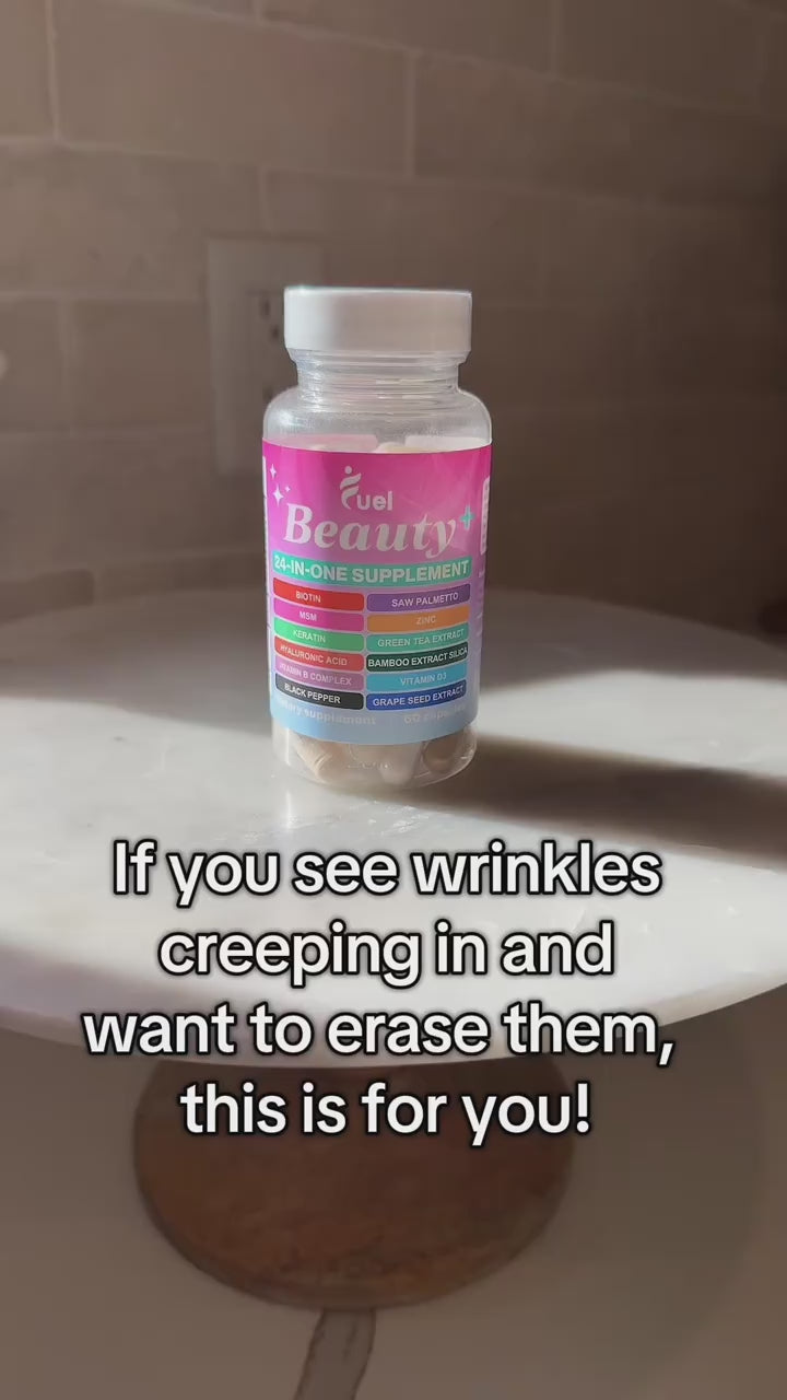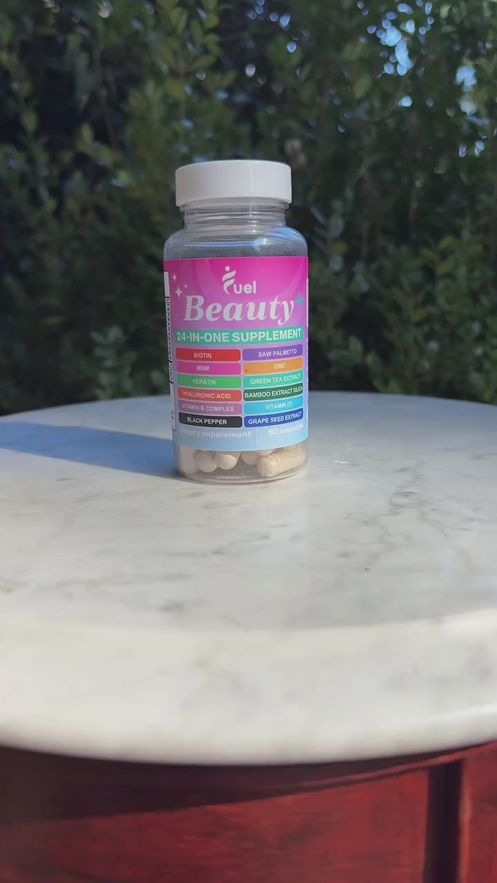 Fuel Beauty+ is a complete 24-in-1 beauty supplement designed to support radiant skin, thicker hair, and stronger nails. With powerful ingredients such as Biotin, Saw Palmetto, Vitamin B Complex, and Hyaluronic Acid, this advanced formula targets the root causes of hair loss, while also providing hydration and antioxidant protection. Enhanced with Black Pepper Extract for maximum absorption, Beauty+ delivers results you can see and feel.