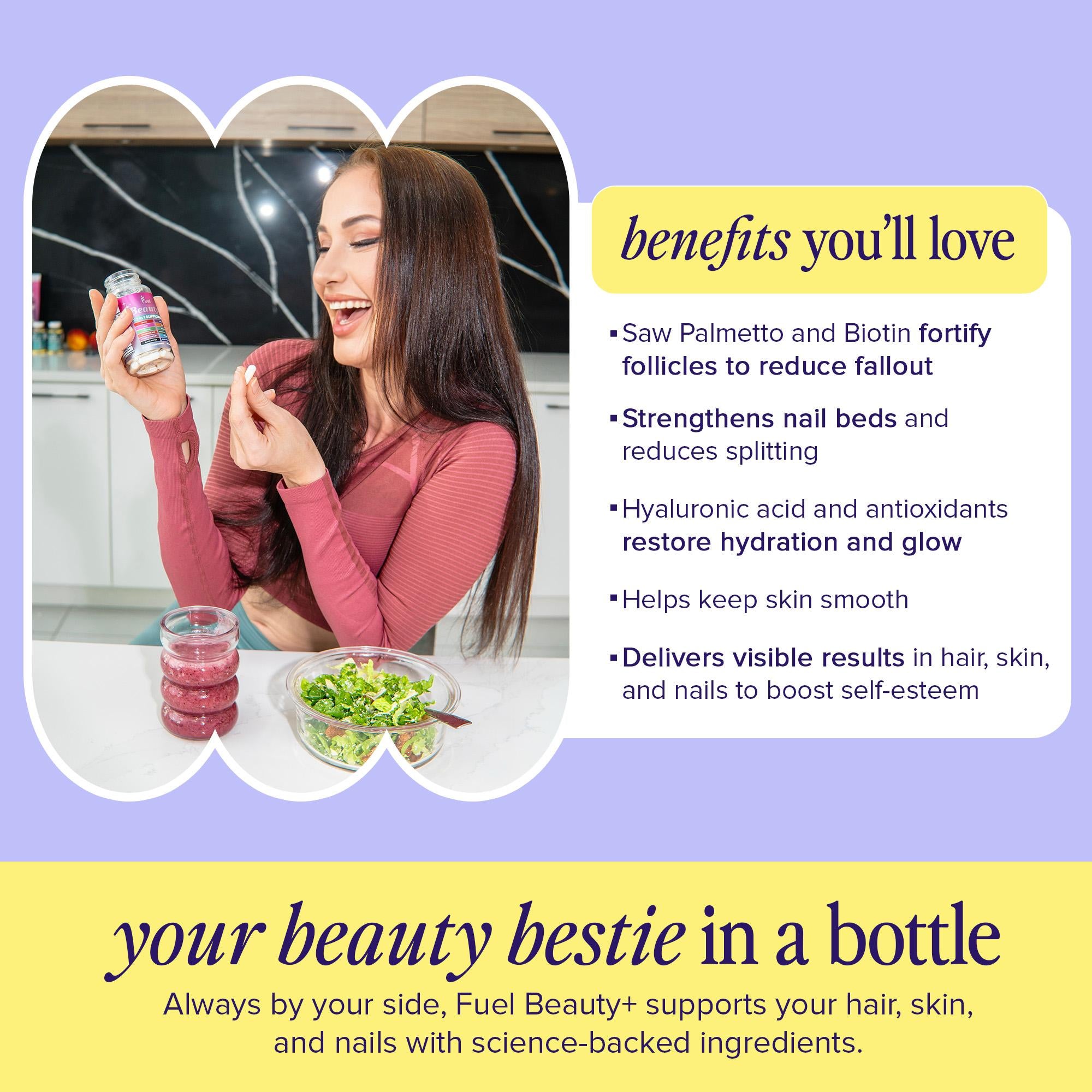 Stop juggling multiple bottles. Fuel Beauty+ is the simple, complete solution for thicker hair, glowing skin, and stronger nails.