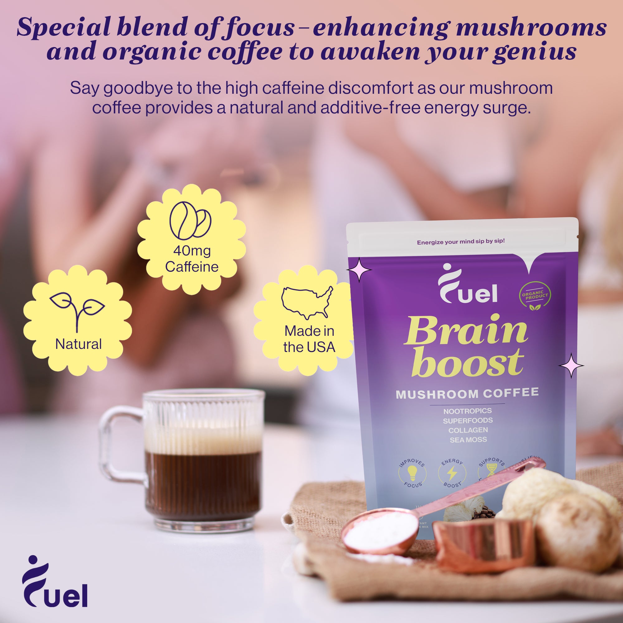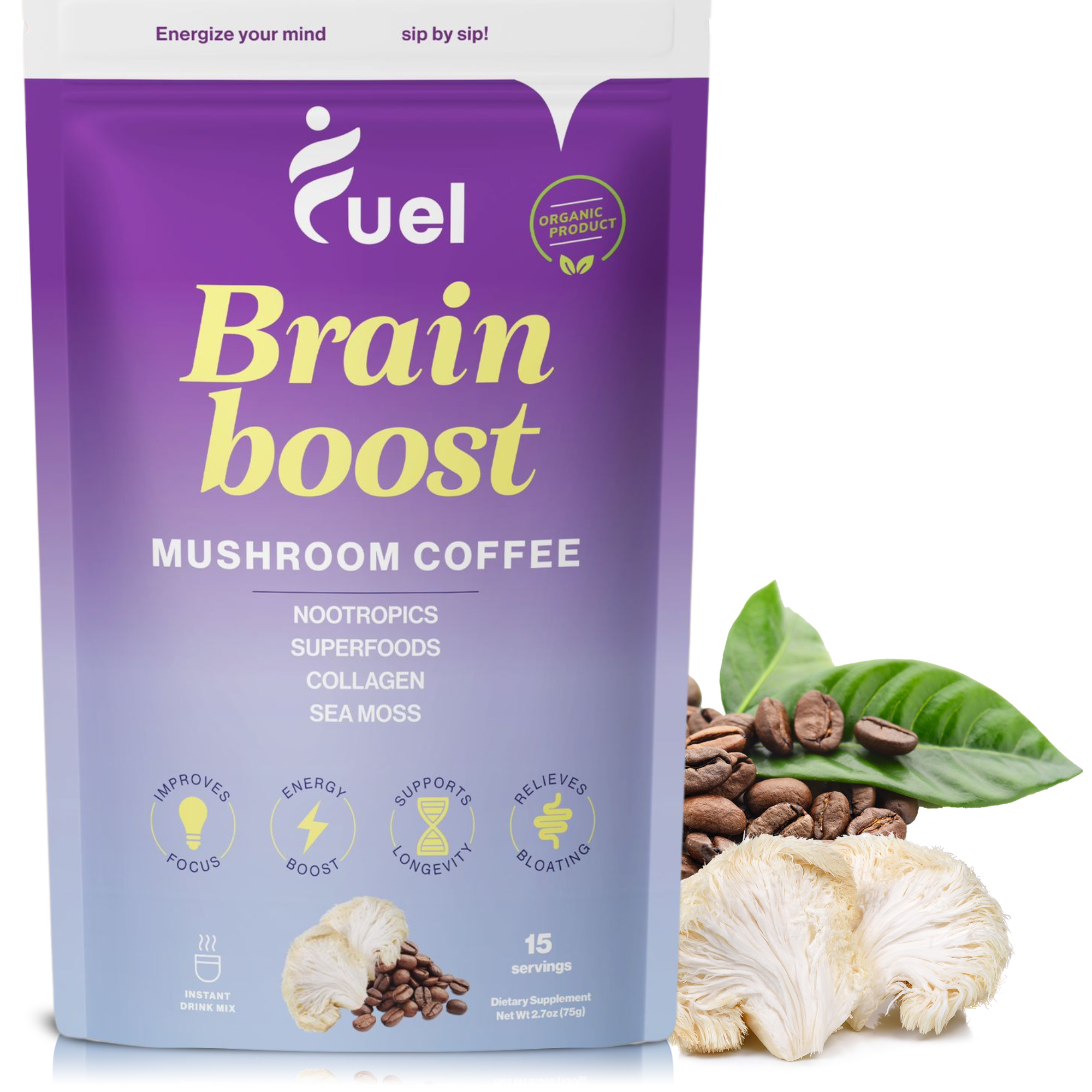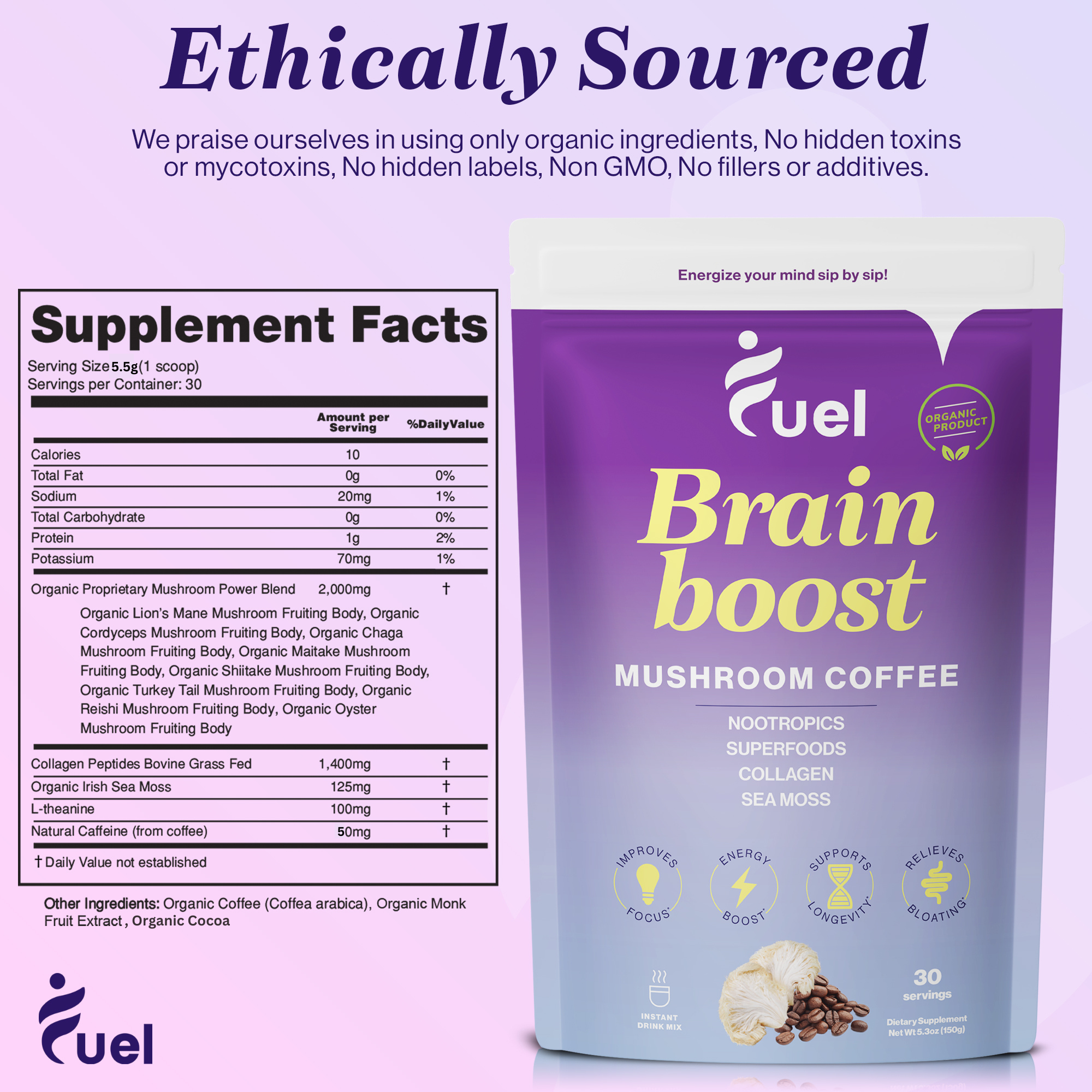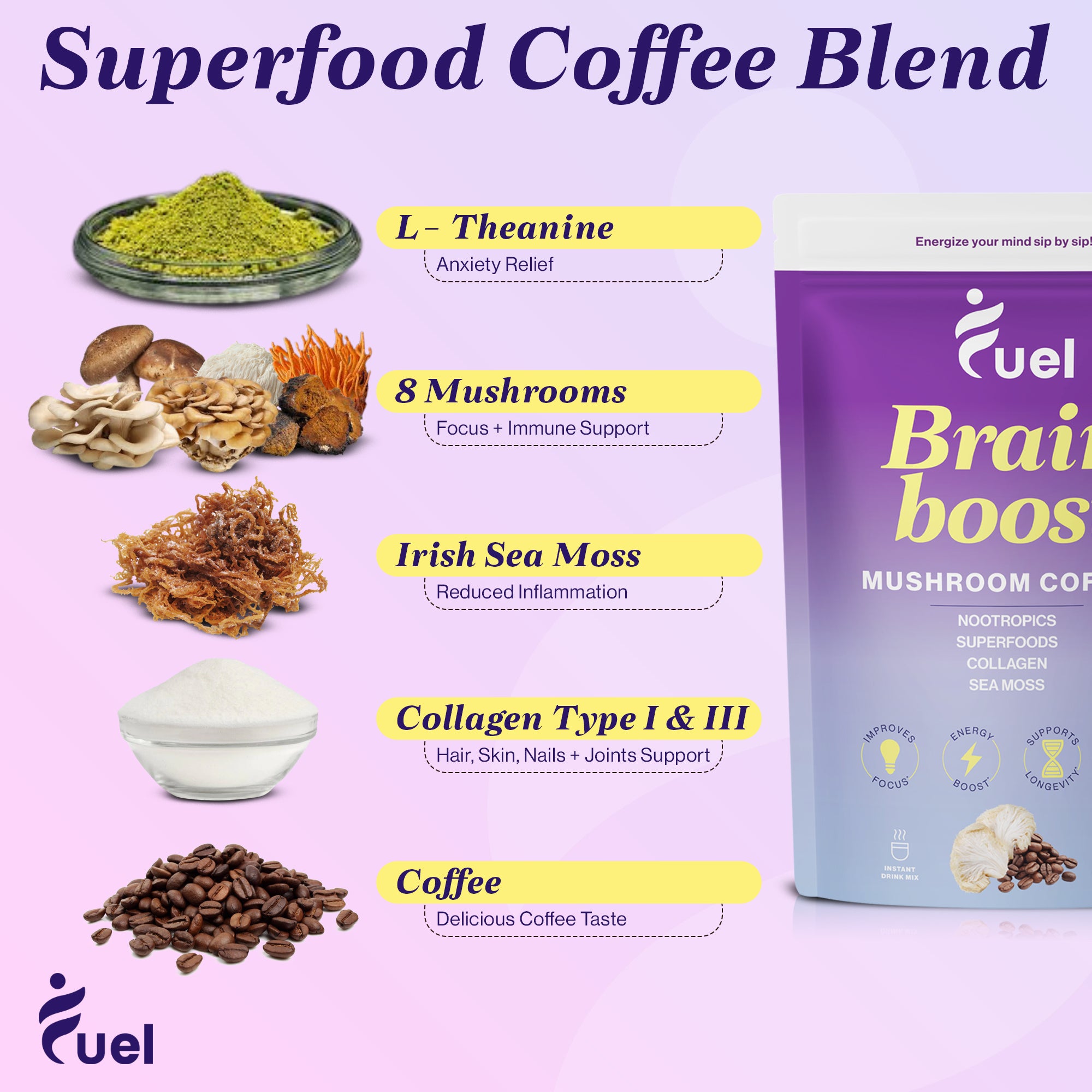 Brain Boost Coffee is a mix of 10 mushrooms, including Chaga, Cordyceps for energy, Reishi for relaxation, Maitake, Shiitake, Turkey Tail and Oyster. This mushroom powder coffee is enriched with Colombian coffee, MCT Oil for mental focus and Collagen Peptides for skin hydration and hair support.