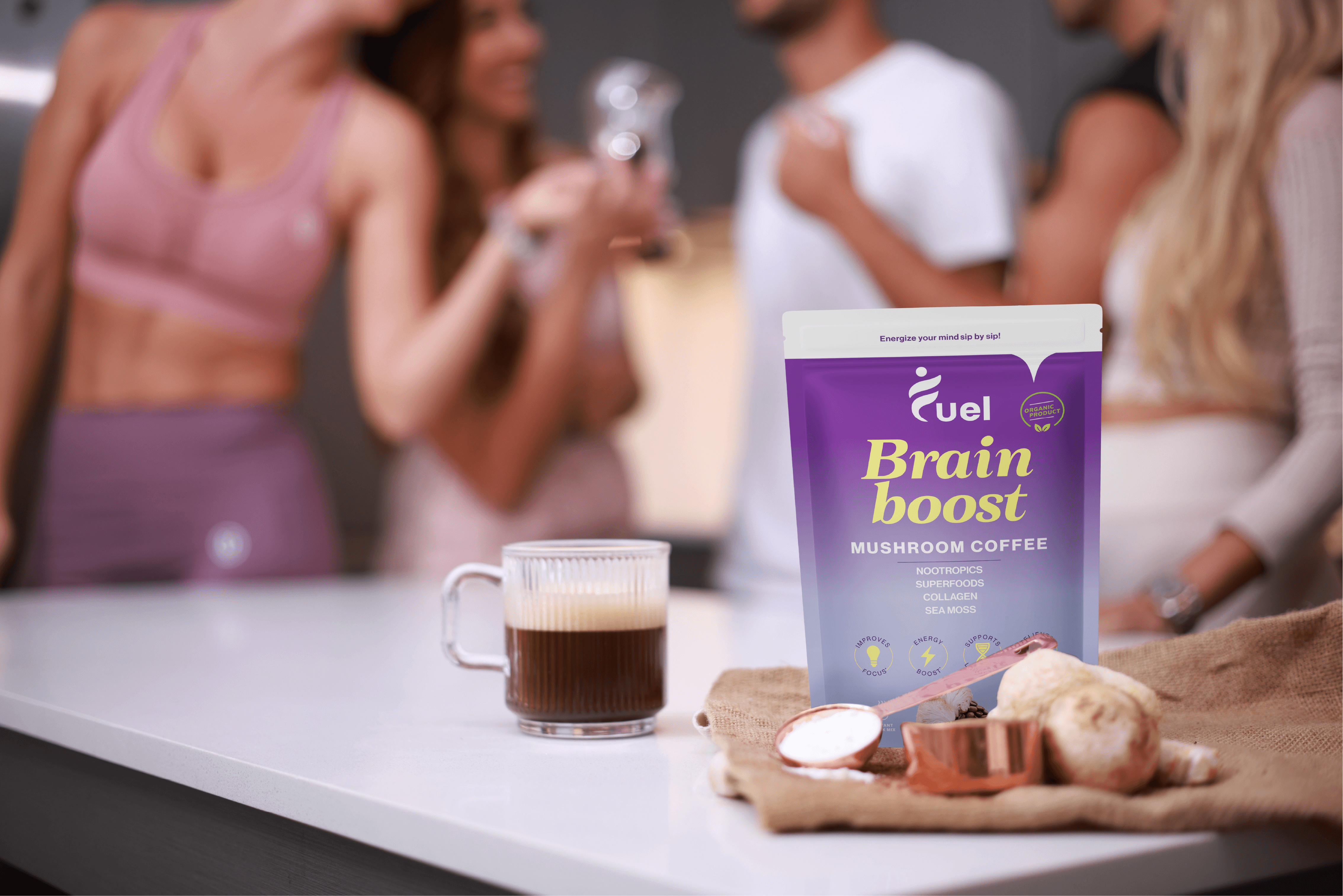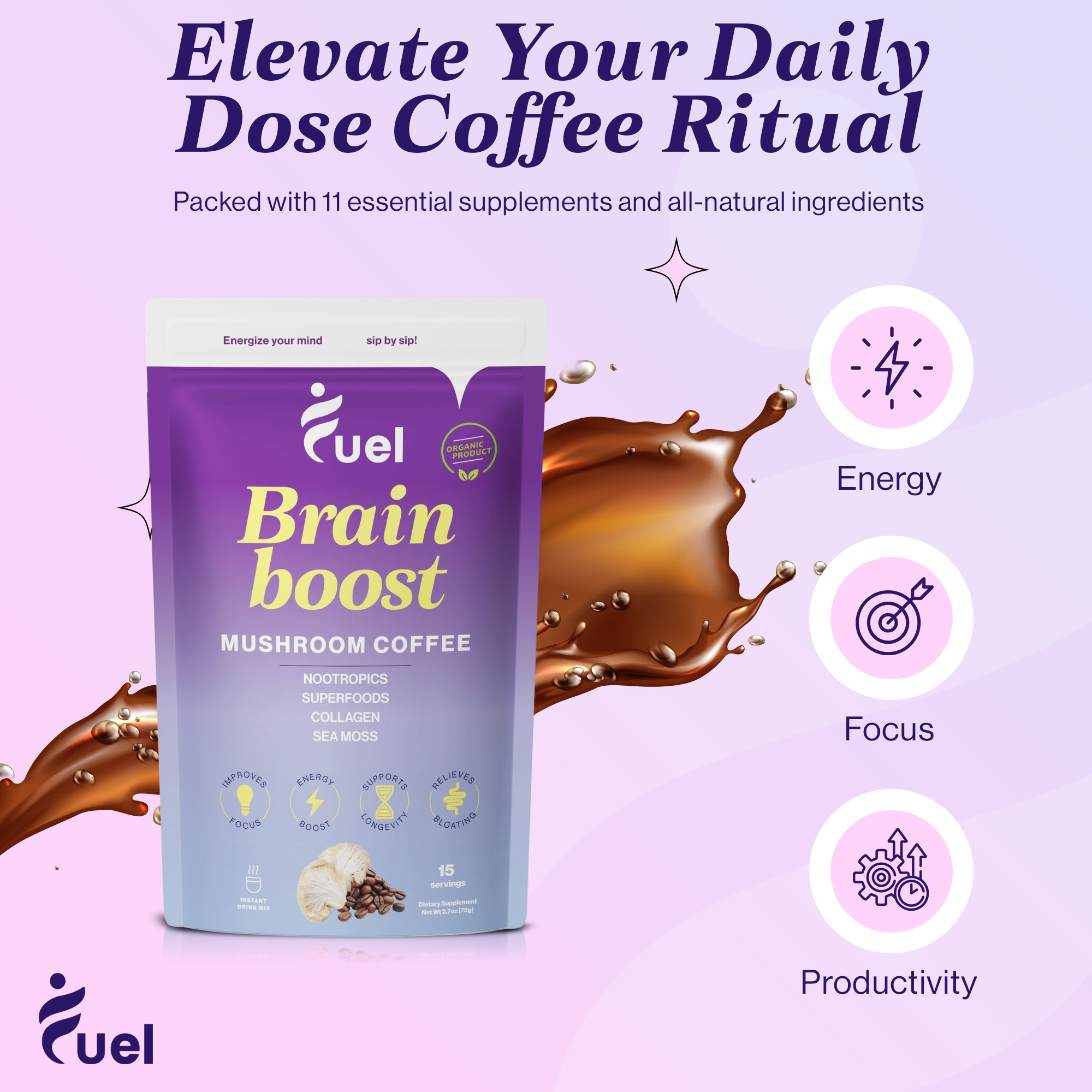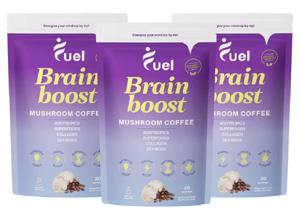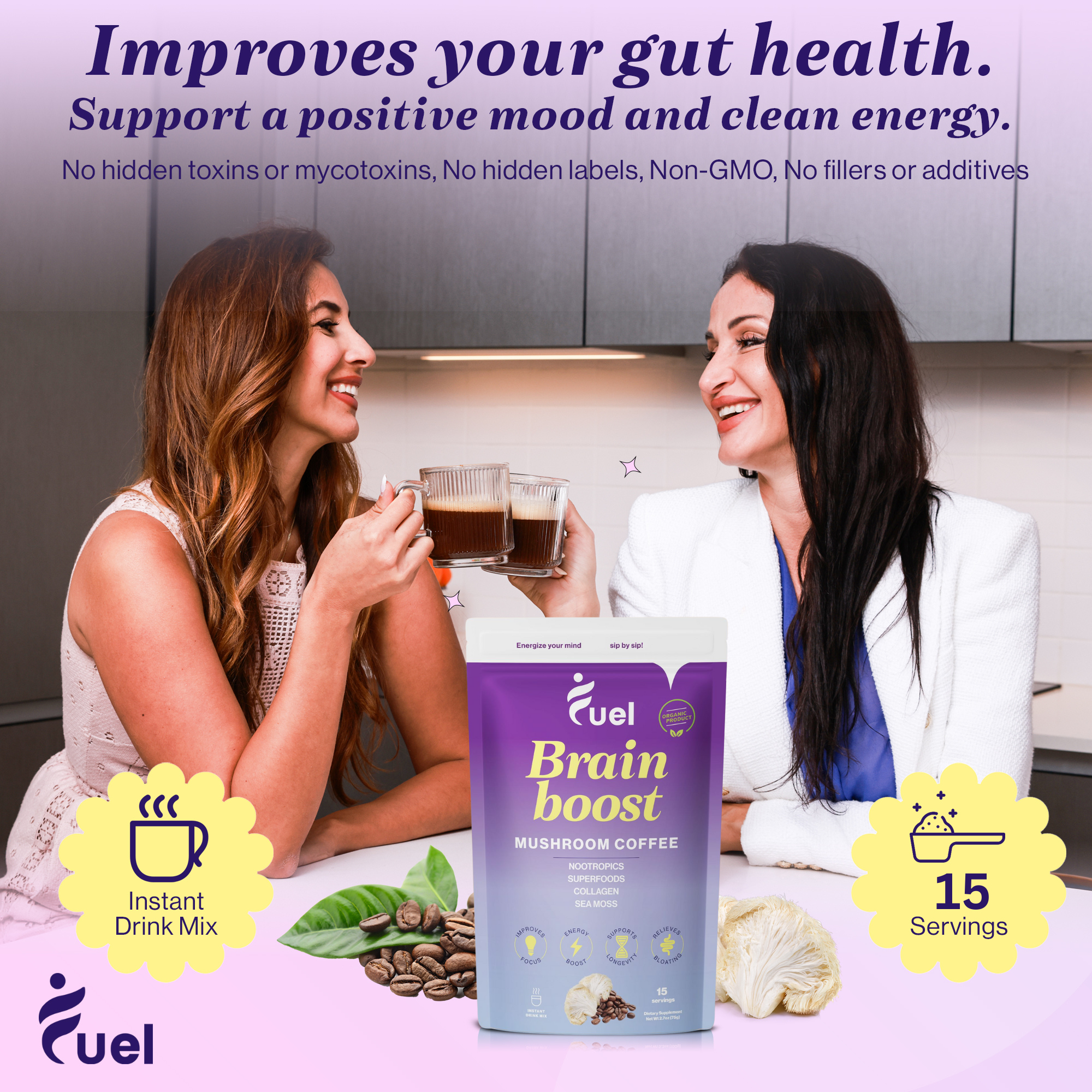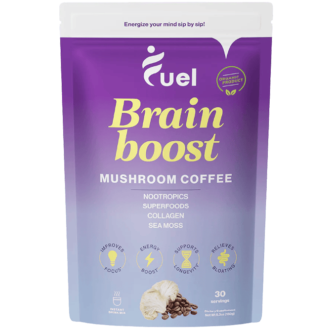 Brain Boost Coffee is a mix of 10 mushrooms, including Chaga, Cordyceps for energy, Reishi for relaxation, Maitake, Shiitake, Turkey Tail and Oyster. This mushroom powder coffee is enriched with Colombian coffee, MCT Oil for mental focus and Collagen Peptides for skin hydration and hair support.