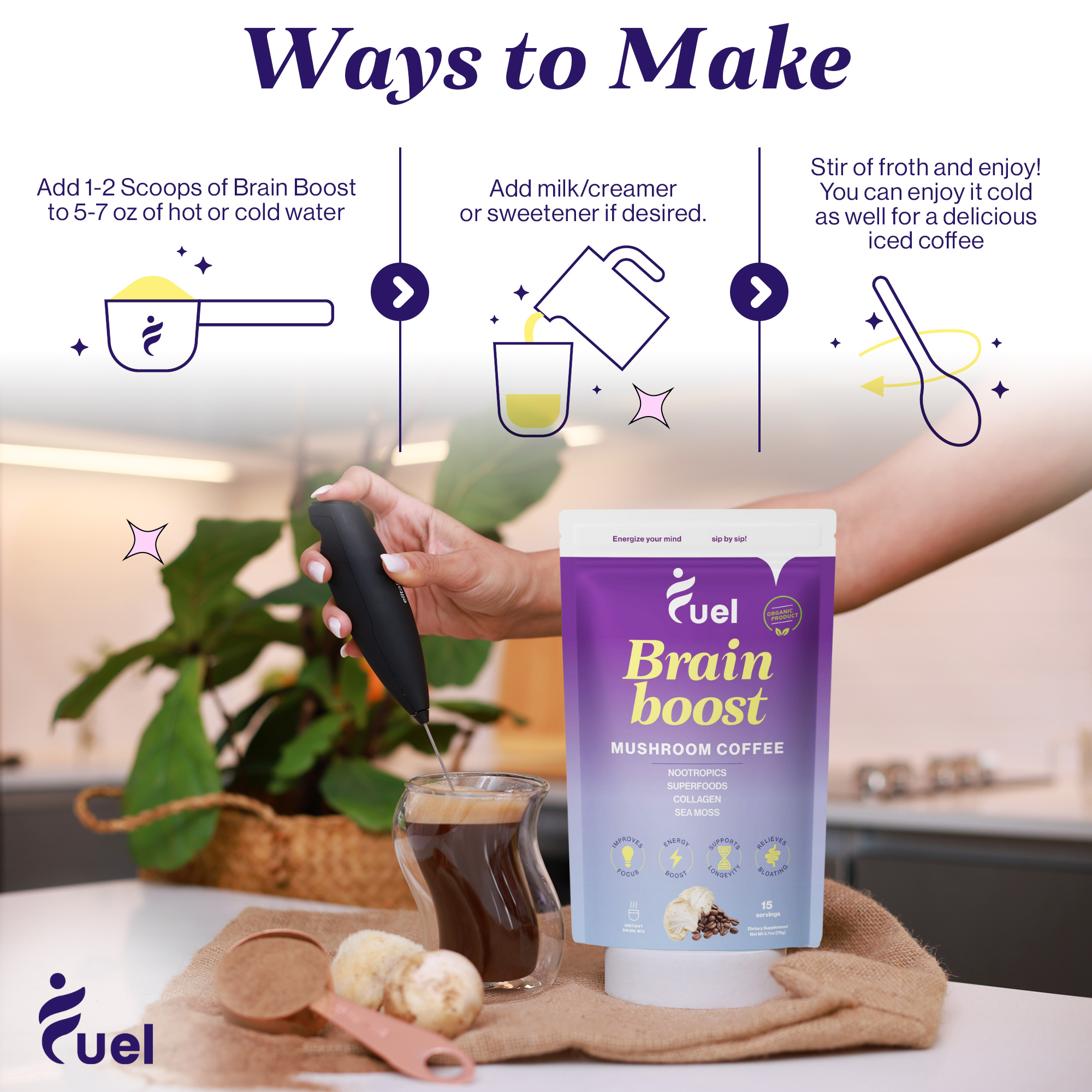 Taste like a delicious cup of coffee, not like mushrooms. Brain Boost Coffee has a very pleasant nutty and earthy flavor similar to coffee. It can be served simply by mixing it in 6-8 oz of hot or cold water, stir with a spoon or frother , add milk/creamer if desired and enjoy.